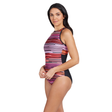 Inspiration from Morocco. With traditional colours used in a modern way. The horizontal lines really stand out on the front and continue on the straps. It's ideal for lap swimming and with the wide crossback straps also make it suitable for splashing around with the kids. With a shelf bra for extra comfort this swimsuit is ideal for cup sizes A - DD and is available in sizes 8 - 18. Made from our innovative Ecolast™ fabric which is highly chlorine resistant, and made with recycled plastic bottles, this swimsuit is bound to a hit.